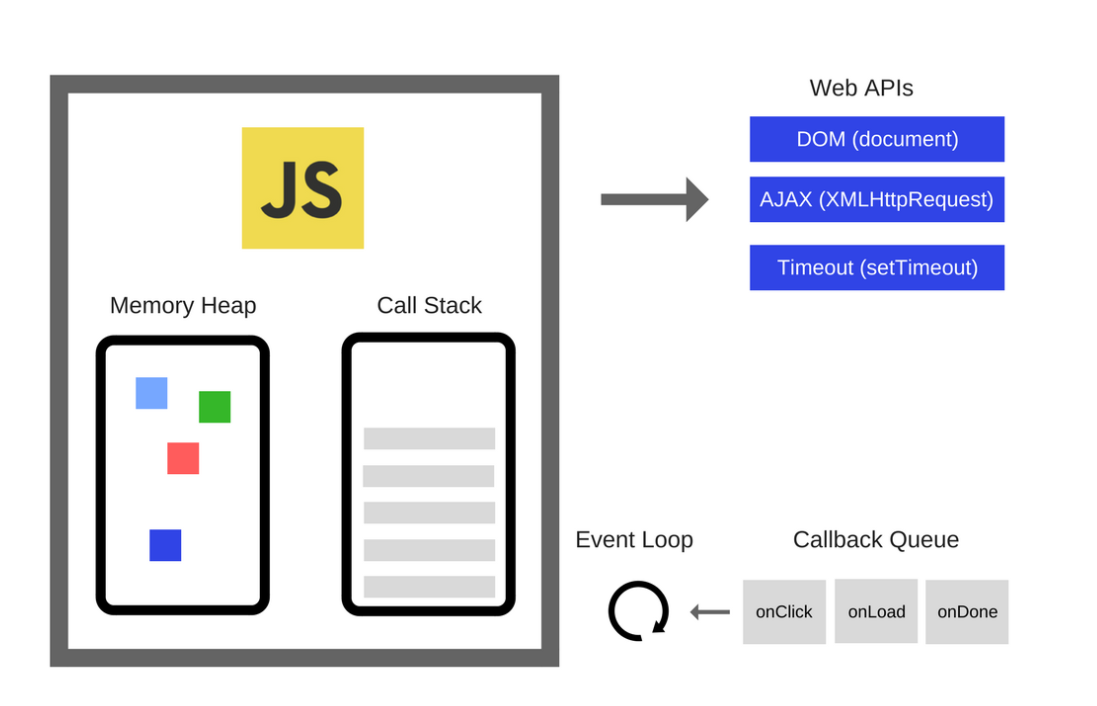 자바스크립트 엔진 외에도 관여하는 다른 요소로는 DOM 이나 timeout같은 WEB API가 있다.