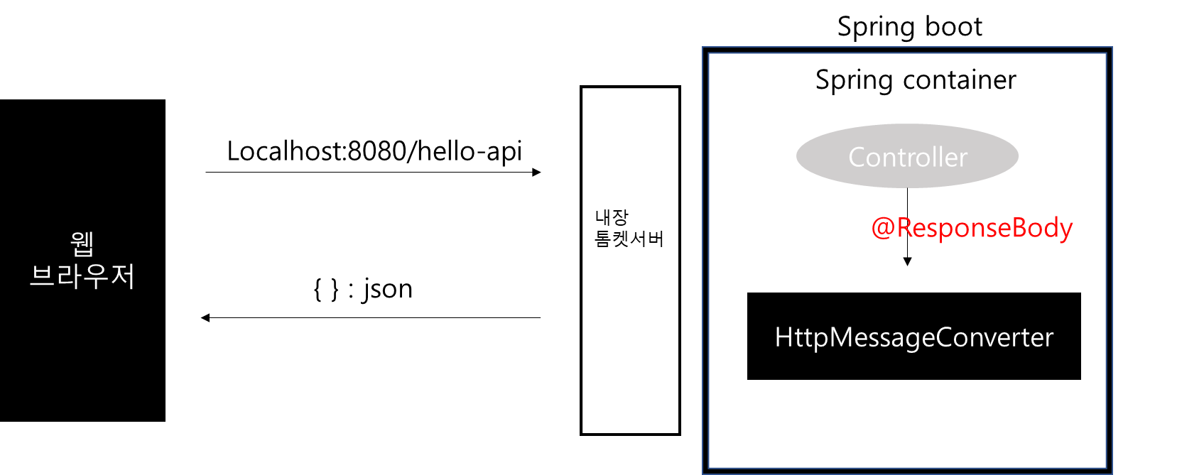 - 1번에서의 viewResolver가 아니라 스프링 부트의 HttpMessageConverter가 동작을 하게 된다.